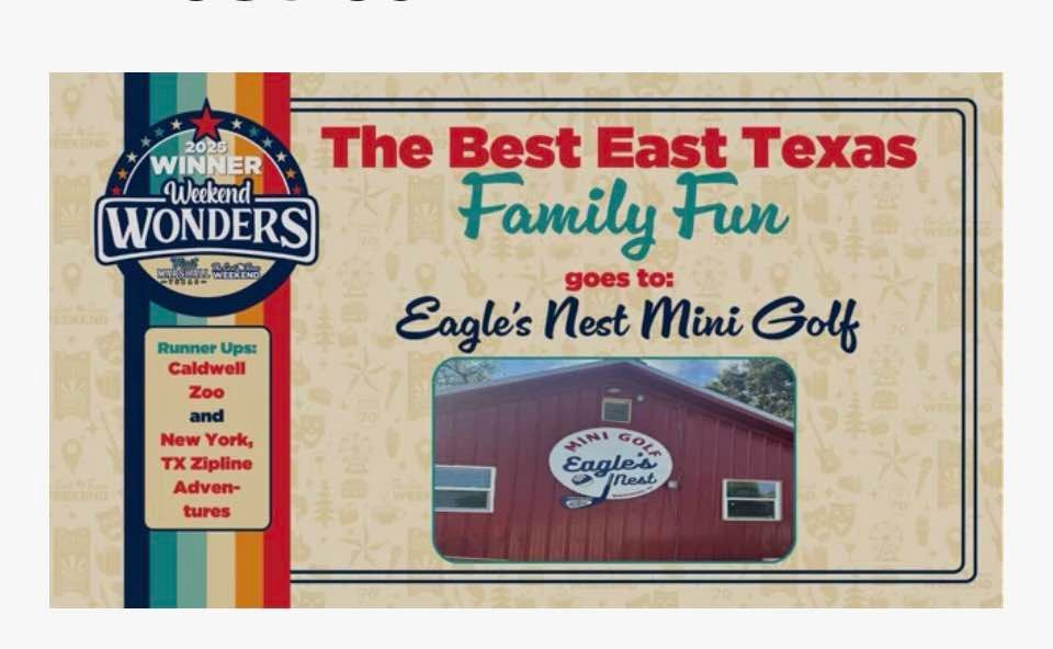 We are grateful for all of the support and time that everyone put into helping us be voted as The Best in East Texas for Family Fun. Swing by for a great mini golf experience!